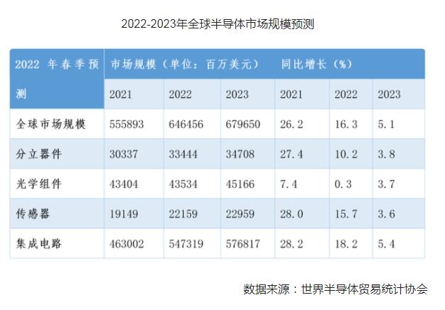 雖然面臨疫情防控、世界經(jīng)濟(jì)復(fù)蘇放緩等一系列不確定性因素,集成電路產(chǎn)業(yè)仍在承壓前行。世界半導(dǎo)體貿(mào)易統(tǒng)計(jì)協(xié)會(huì)6月發(fā)布的春季預(yù)測(cè)顯示,2022年全球半導(dǎo)體市場(chǎng)規(guī)模將增長(zhǎng)16.3%,繼2021年年增26.2%之后繼續(xù)保持兩位數(shù)的增長(zhǎng),達(dá)到6460億美元。集成電路、傳感器、分立器件等主要半導(dǎo)體品類的市場(chǎng)規(guī)模也將保持兩位數(shù)增長(zhǎng)。