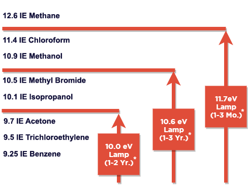 因此,燈的選擇取決于應用。當僅存在一種化合物時,可以使用任何具有足夠能量的燈,通常是標準的10.6eV燈,其具有較低的成本點并且具有長達幾年的長工作壽命。相反,11.7 eV燈的壽命只有幾個月。