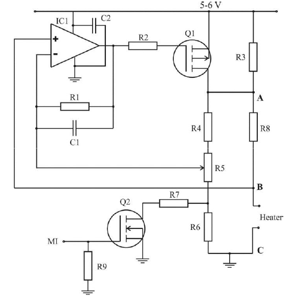 加到加熱器的應(yīng)用電壓取決于環(huán)境和氣流,但是對于400℃,將是在2.5-2.9V之間。這個(gè)電路也