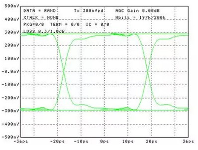如圖所示,在對應28Gbps的頻點上,信號能量被衰減了30db,電壓幅度只剩3%了;在對應56Gbps的頻點上更慘,65db意味著信號電壓擺幅剩下不到千分之一。在這種信道中,發(fā)送端一個完美漂亮的數據眼圖: