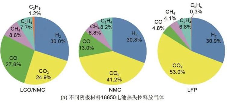 從餅圖中可看出,電池在熱失控過程中產(chǎn)生這些主要氣體的組分構(gòu)成非常類似,如圖所示 氣體成分主要為二氧化碳(CO2)、氫氣(H2)、一氧化碳(CO),其余小部分氣體主要為小分子烴類物質(zhì)(CH4、C2H4等)。