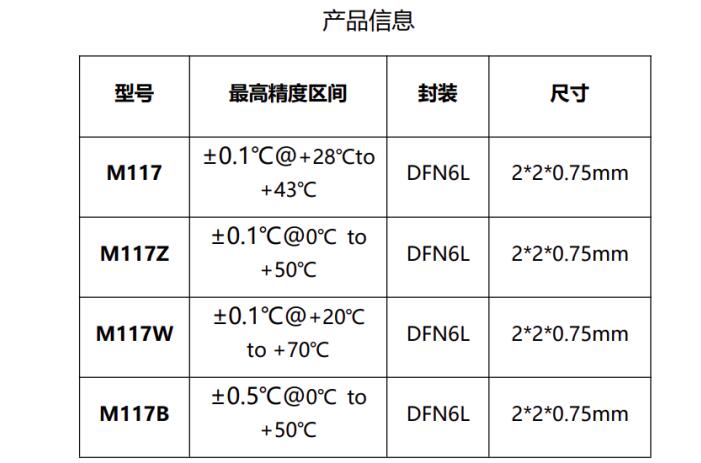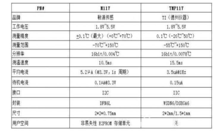2、在功耗上,1Hz采樣情況下,M117溫度傳感芯片功耗略高,但是待機(jī)電流更低一些,可以為穿戴設(shè)備產(chǎn)品提供更長的使用時間。