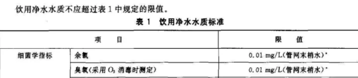 CJ94-2005(飲用凈水水質(zhì)標(biāo)準(zhǔn))中規(guī)定使用臭氧對飲用凈水消毒時,管網(wǎng)末梢水中余量不超過0.01mg/L。
