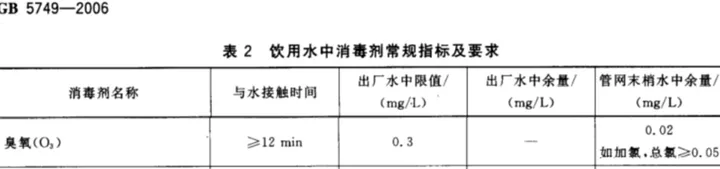 GB5749-2006(生活飲用水衛(wèi)生標(biāo)準(zhǔn))中規(guī)定使用臭氧消毒劑進(jìn)行消毒時,消毒劑要與水接觸不少與12分鐘,出廠水中臭氧含量不超過0.3mg/L,管網(wǎng)末梢水中余量不超過0.02mg/L。