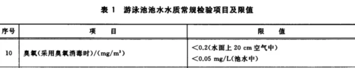 CJ/T244-2016(游泳池水質(zhì)標(biāo)準(zhǔn))中規(guī)定使用臭氧對泳池水消毒時,水面上20cm空氣中臭氧含量要小于0.2mg/m3,池水中限值不超過0.05mg/L。