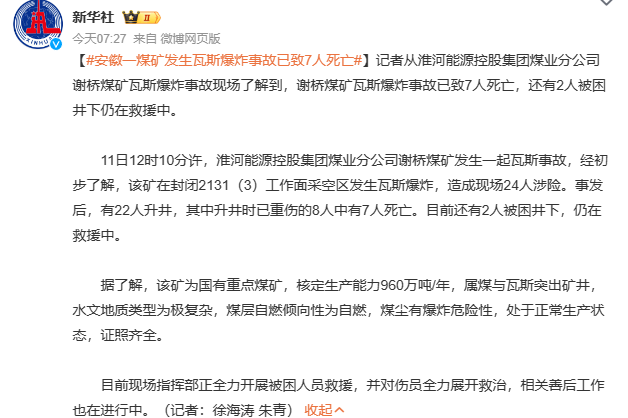 3月11日12時(shí)10分,安徽省淮河能源控股集團(tuán)煤業(yè)分公司謝橋煤礦發(fā)生一起瓦斯事故,經(jīng)初步了解,該礦在封閉2131(3)工作面采空區(qū),發(fā)生瓦斯爆炸,造成現(xiàn)場24人涉險(xiǎn),事發(fā)后,有22人升井,其中升井時(shí)已重傷的8人中有7人死亡,目前還有2人被困井下,仍在救援中.