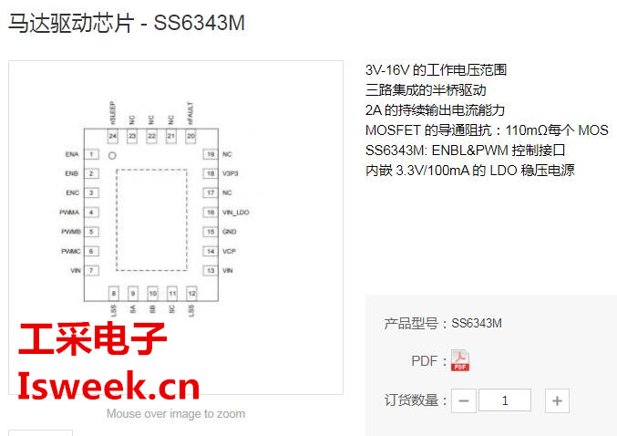 由工采網(wǎng)代理的SS6343M是一款針對三軸手持云臺相機(jī)-三軸無刷云臺-無人機(jī)云臺推出的三相直流無刷電機(jī)驅(qū)動(dòng)芯片;該芯片具有輸出電流大、導(dǎo)通內(nèi)阻低、輸入內(nèi)壓高、超小型封裝、性能卓越,芯片性價(jià)比高等優(yōu)勢;其軟硬件完全可PIN TO PIN兼容替代MP6543。