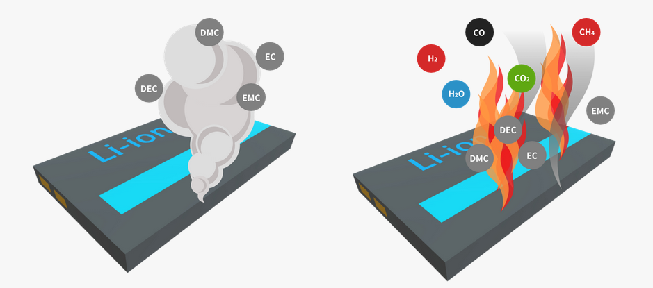 鋰離子電池(LIB)發(fā)生異常時(shí),其產(chǎn)生的氣體主要成分除了氫氣(H2)、一氧化碳(CO)、甲烷(CH4)、二氧化碳(CO2)以外,還存在烴類VOC氣體(EMC、DMC、ECD等※)。