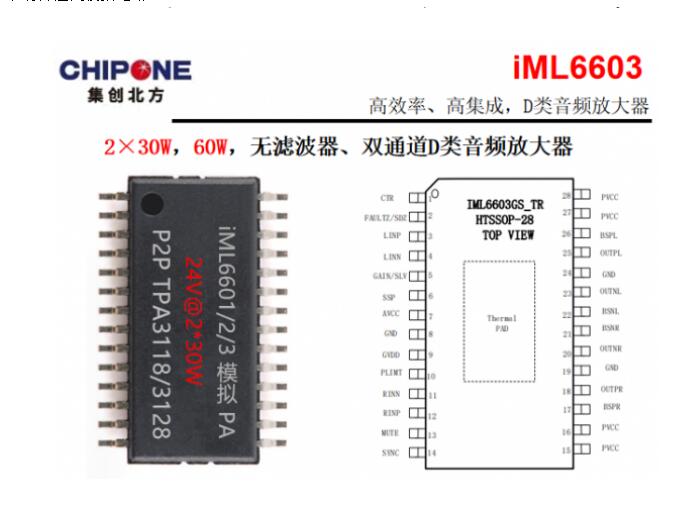 最后是音頻放大器 - iML6603,是一款高集成、高效率的雙通道D類音頻放大器;該芯片具有低失真、低噪聲和高動態(tài)范圍的特點(diǎn);能夠輸出高達(dá)60W的功率,并支持4Ω、8Ω的揚(yáng)聲器負(fù)載;采用了寬輸入電壓范圍和高抗干擾能力的設(shè)計(jì),擁有MUTE+擴(kuò)頻+2.1聲道同步+跳頻功能;支持4Ω、8Ω揚(yáng)聲器負(fù)載;可Pin-to-Pin兼容替代TI TPA3128;可以適應(yīng)各種音頻應(yīng)用場景。