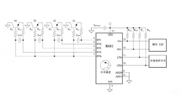 M401帶4路遠(yuǎn)端測溫,TMP423只有3路,加上本地的1路可以實現(xiàn)5路測溫功能。同時帶兩位I2C地址位,可以實現(xiàn)多芯片組網(wǎng)功能,做到更多點測溫。