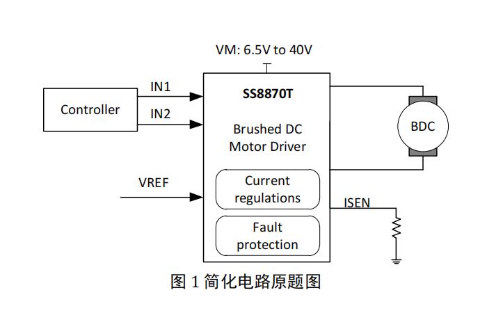 SS8870T具有集成電流調(diào)節(jié)功能,該功能基于模擬輸入VREF以及ISEN引腳的電壓(與流經(jīng)外部感測電阻的電機電流成正比), 該器件能夠?qū)㈦娏飨拗圃谀骋灰阎?,這可顯著降低系統(tǒng)功耗要求,并且無需大容量電容來維持穩(wěn)定電壓,尤其是在電機啟動和停轉(zhuǎn)時。