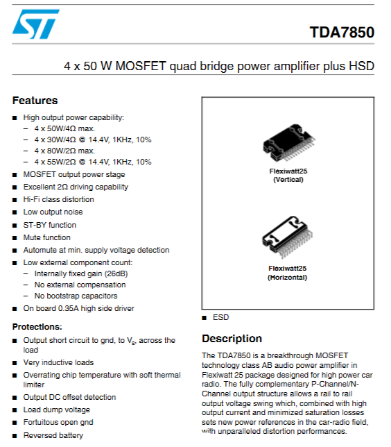 TDA7850是一種高性能、低成本的汽車(chē)音頻功率放大器集成電路。它是一款4通道、50W的BTL(橋接輸出)音頻功率放大器,專(zhuān)為汽車(chē)音頻應(yīng)用而設(shè)計(jì)。