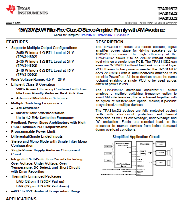 支持雙路30W的輸出功率;提供2CH (30W x 2 BTL@24V, 4Ω)以及2.1CH (10W x 2 + 30W @24V, 4Ω)輸出配置;其低失真、高信噪比和穩(wěn)定的性能使得音頻輸出清晰、細(xì)膩,讓用戶享受真實(shí)的音樂(lè)體驗(yàn)。