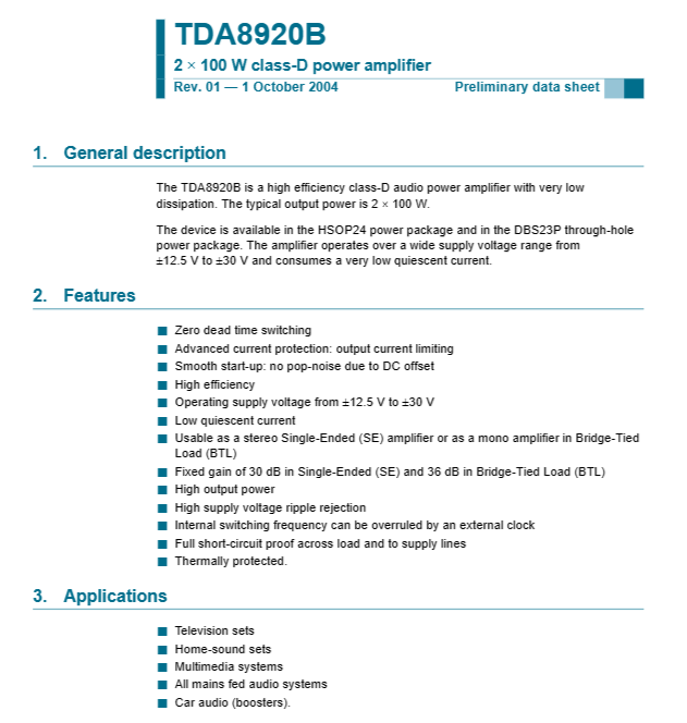 TDA8920BTH是一款高度集成的芯片,集成了放大器電路、電源管理和保護(hù)電路。采用了NXP的第三代DMOS功率放大技術(shù),具有低失真、高效率和優(yōu)異的音質(zhì)表現(xiàn)。該芯片的輸出功率可以高達(dá)2x100W(4Ω負(fù)載,THD+N<10%)滿足了大多數(shù)音頻系統(tǒng)的功率需求。