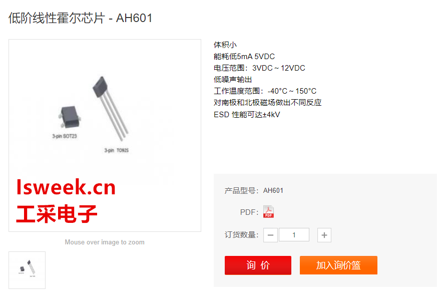 工采網(wǎng)代理的AH601是一款小型多功能經(jīng)濟(jì)型的線性霍爾傳感器。工作原理是當(dāng)磁場(chǎng)輸入時(shí),輸出和輸入量是成比例變化電壓,靜態(tài)輸出電壓大小由電源電壓設(shè)定。該傳感器具有低噪聲輸出,無(wú)需外部濾波的特點(diǎn)。