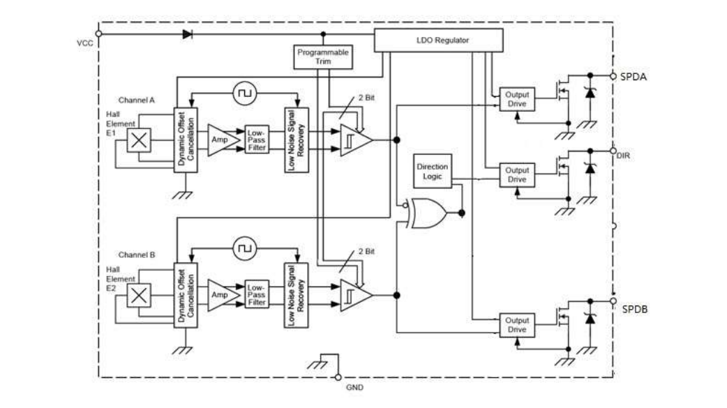 工采網(wǎng)代理的霍爾傳感芯片 - AH700是一款內(nèi)置2個霍爾效應(yīng)元件的速度方向傳感器系列。每個元件提供一個獨立的數(shù)字信號輸出用于速度和方向的信號處理。該芯片內(nèi)部包括兩個相距1.63mm的霍爾傳感元件,包括霍爾電壓發(fā)生器、電源電壓為3.8~30V的電壓調(diào)節(jié)器、溫度補償電路、小信號放大器、動態(tài)偏移消除系統(tǒng)霍爾傳感器、施密特觸發(fā)器和開漏輸出。處理速度和方向信號很方便。