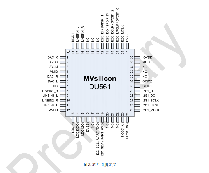 DU561芯片為從機(jī)模式DSP,可對音樂播放進(jìn)行實時音效處理,LQFP48封裝;能在溫度:-40℃到 85℃環(huán)境下工作;支持低功耗 Deepsleep 模式;支持8~192KHz采樣率,較大有效位寬32bits;支持直驅(qū)16Ω或32Ω耳機(jī),較大輸出功率為40mW;2個全雙工I2S;1個S/PDIF輸入接口;模擬LINEIN支持單端輸入或差分輸入。