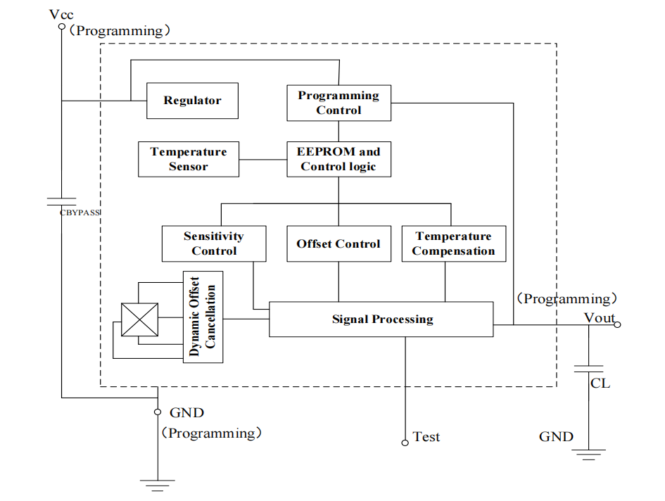 AH810采用過流保護高帶寬動態(tài)偏移抵消技術(shù),在無磁場的情況下,靜態(tài)輸出可選50%VCC或者2.5V固定值。內(nèi)部集成的動態(tài)失調(diào)消除電路使IC的靈敏度不受外界壓力和IC封裝應(yīng)力的影響。