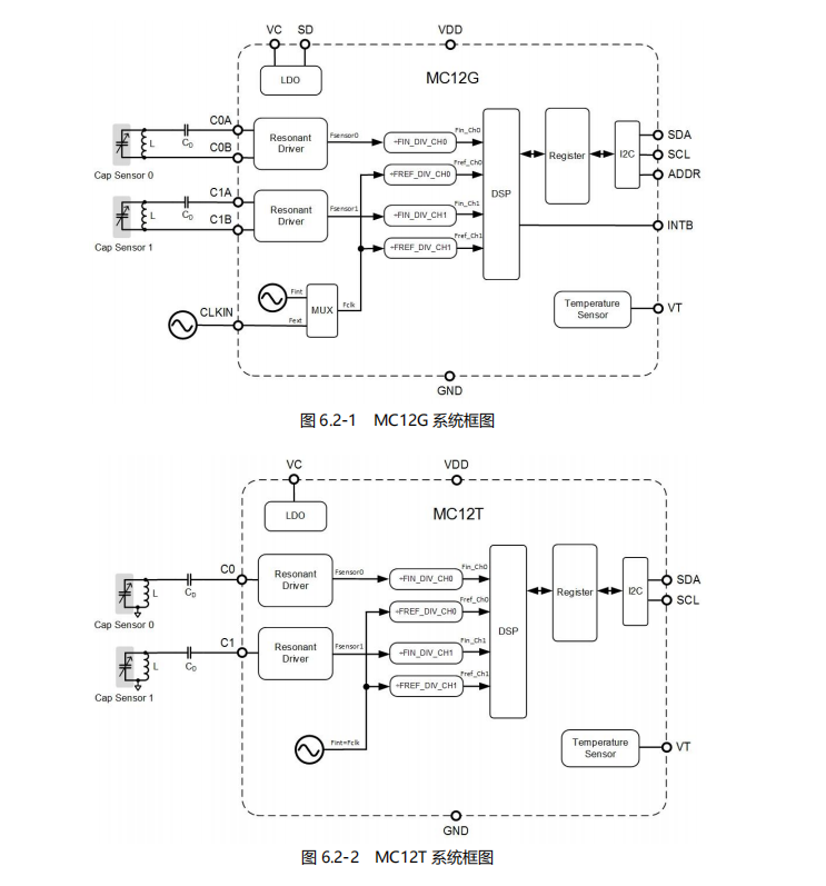 工采網(wǎng)代理的MC12G、MC12T是高集成度雙通道電容型傳感芯片,芯片測量單端對地電容,直接與被測電容極板相連,通過甚高頻諧振激勵并解算測量微小電容的變化。激勵頻率在10~100MHz范圍內(nèi)可配置,其頻率測量輸出為16bit數(shù)字信號,對應的電容感知較高分辨率為0.5ff。芯片采用全數(shù)字化設計,功能配置及數(shù)據(jù)讀寫支持較高1MHz的I2C通信速率;內(nèi)置低噪聲電源管理模塊LDO,可適配寬輸入電壓范圍。此外,芯片還集成了溫度傳感電路,可用于進行溫度補償及其他溫度傳感場景。