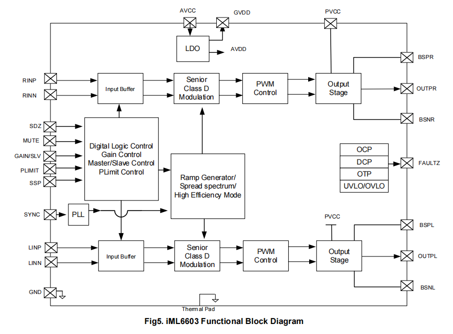 芯片內(nèi)置了多種保護(hù)功能,如過溫保護(hù)、過電流保護(hù)和短路保護(hù),旨在確保系統(tǒng)的穩(wěn)定性和安全性。此外,該芯片還提供了直流偏置和AC耦合輸入方式,從而能夠靈活適應(yīng)不同的音頻輸入需求。