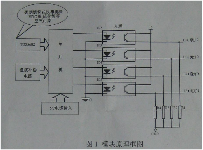 根據(jù) TGS2602 傳感器對(duì) VOC、氨氣、硫化氫等空氣污染進(jìn)行檢測(cè),通過(guò)單片機(jī)對(duì)傳感器、溫度等信號(hào)處理并判斷污染等級(jí),對(duì)應(yīng)污染等級(jí)產(chǎn)生高電平輸出,實(shí)現(xiàn)對(duì)空氣質(zhì)量的檢測(cè)及控制功能