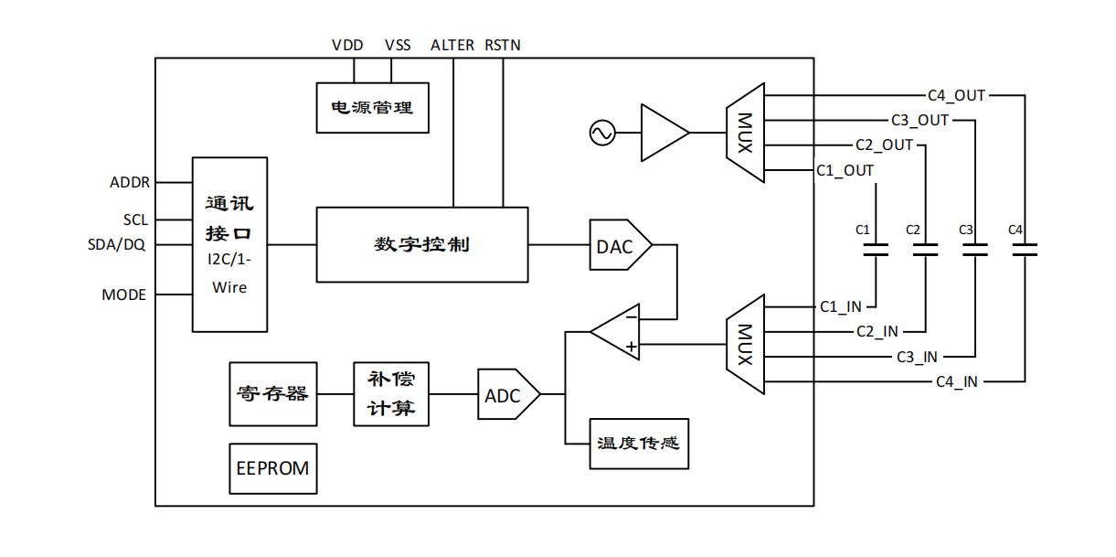 芯片內(nèi)部集成高精度16bit模數(shù)轉(zhuǎn)換ADC電路,其電容分辨率為0.1fF,線性度誤差小于0.3%。此外,芯片內(nèi)置精度0.5℃的溫度傳感電路,可用于溫度補(bǔ)償及其他溫度傳感場(chǎng)景。
