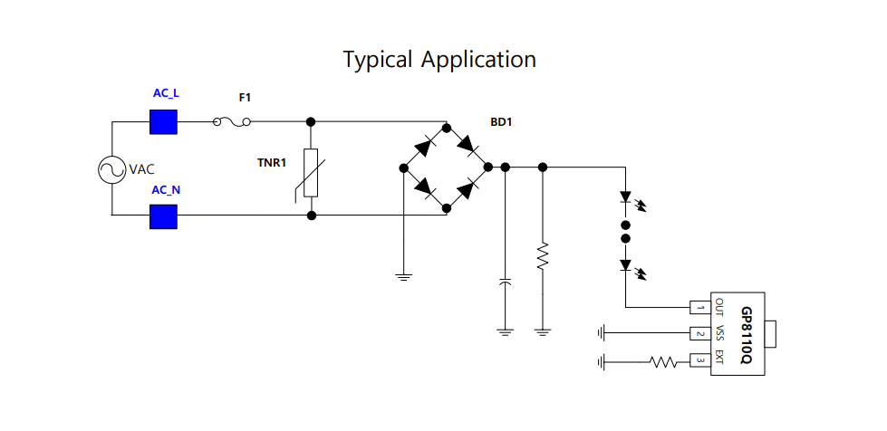 GP8110Q可以用作開關(guān)或電流調(diào)節(jié),因此適合用簡(jiǎn)單的一個(gè)端子LED字符串調(diào)節(jié)電流,這是非常低的成本。它也適用于用多端子LED字符串調(diào)節(jié)電流,這是良好的THD。
