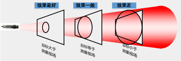 如果不考慮測量物體表面某一處的溫度,而是只要測量整個物體的平均溫度,那應確保被測物的直徑等于或大于被測區(qū)域尺寸。下圖中,矩形代表被測物體,其中左側(cè)的“被測物a”表面積大于在該距離上的被測區(qū)域尺寸,所以測量效果好。而“被測物b”由于離傳感器稍遠,它的面積恰等于被測區(qū)域尺寸,因而測量效果一般。即測溫儀同在測量背景物體,從而降低了讀數(shù)的精確性?!氨粶y物c”則離傳感器太遠,以至其表面積小于被測區(qū)域尺寸,在這種情況下,除了被測物的紅外輻射能量外,傳感器還會收到其余的背景輻射能,從而大大降低了測量精度。