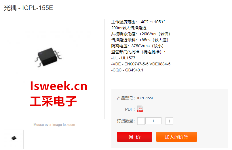 工采網(wǎng)代理的光耦合器 - ICPL-155E由砷化鎵紅外發(fā)光二極管和集成的高增益、高速光電探測器組成。該器件采用SOP5封裝。光電探測器內(nèi)部配備有法拉第屏蔽,確保了±20 kV/us的共模瞬態(tài)抗擾度。ICPL-155E適用于IGBT或功率MOSFET的直接?xùn)艠O驅(qū)動電路。
