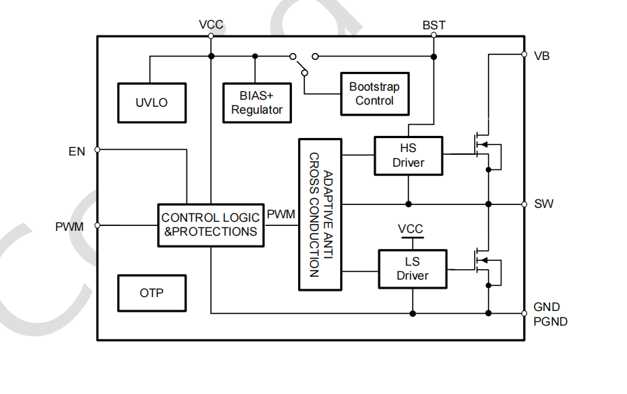 低邊驅(qū)動器集成用于驅(qū)動接地參考的低導通電阻N溝道MOSFET。該低邊驅(qū)動器的電壓軌內(nèi)部連接至VCC和PGND。