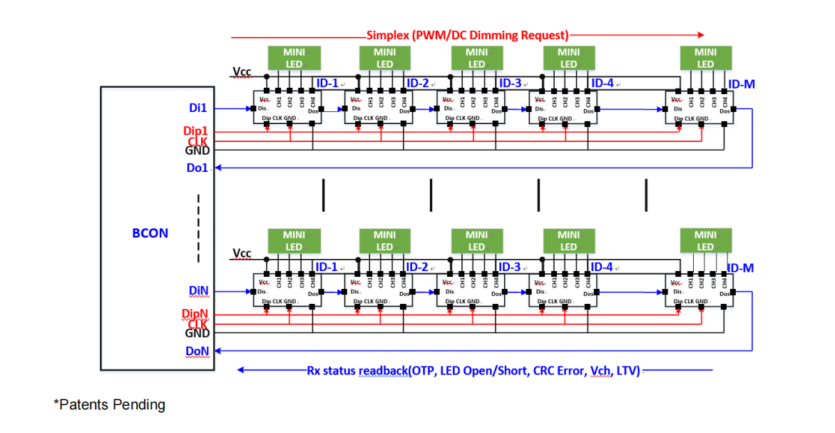 通過BCON發(fā)出的相應(yīng)指令,系統(tǒng)可實(shí)現(xiàn)直接驅(qū)動(dòng)和掃描LED兩種驅(qū)動(dòng)模式。在掃描模式下,BCON支持調(diào)節(jié)掃描行數(shù),并具備頻率倍增功能。直接驅(qū)動(dòng)模式下,基于16Mhz內(nèi)部振蕩器和背光幀率,較大支持64倍頻增。