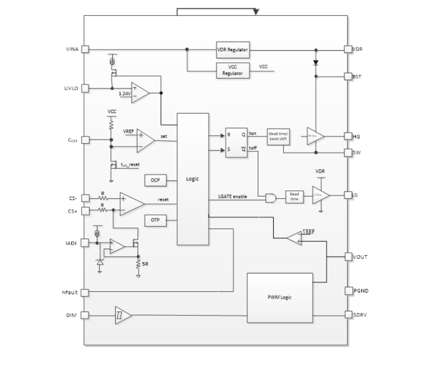 SS8102采用遲滯式恒定關(guān)斷時(shí)間的工作模式,無(wú)需外部補(bǔ)償設(shè)計(jì)。較大簡(jiǎn)化外部器件,其輸出電流能力既可以通過(guò)不同阻值的外接電阻(Rcs)調(diào)整,也可以通過(guò)調(diào)節(jié)模擬調(diào)光控制引腳IADJ上的電壓來(lái)實(shí)現(xiàn)。電流能力可達(dá)25A。通過(guò)DIM管腳輸入PWM信號(hào)來(lái)靈活實(shí)現(xiàn)對(duì)LED的調(diào)光控制。SS8102有同步模式和異步模式兩種工作模式可供選擇,客戶可以根據(jù)自己的需求來(lái)靈活設(shè)計(jì)。