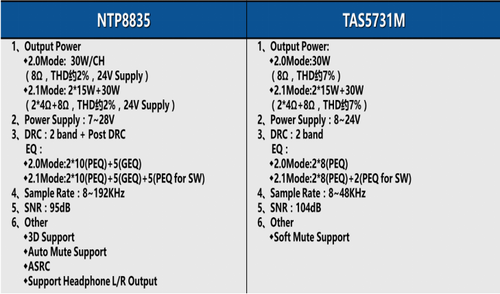 1、內(nèi)部處理器,NTP8835處理頻率達到96K,而TAS5731則是其二分之一(48K);