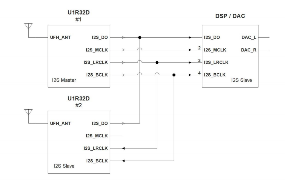 其中DSP模式又分DSP mode A和DSP mode B。支持兩片U1R32D芯片的兩路I2S并聯(lián),共用一條I2S通道連接到后級DSP或者DAC等。