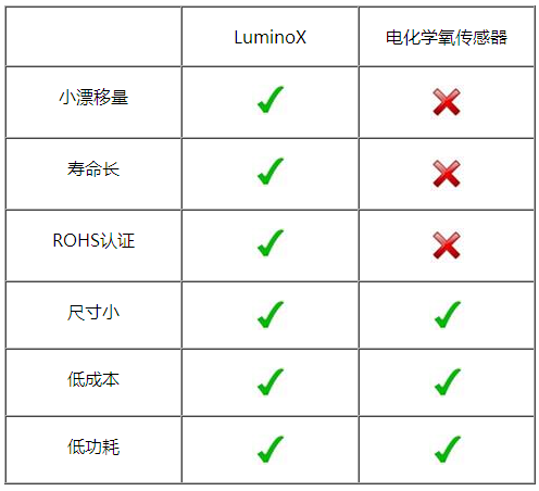 總結(jié):熒光氧傳感器多項(xiàng)指標(biāo)優(yōu)于電化學(xué)氧氣傳感器,并且不含鉛、長壽命以及非消耗傳感原理讓它在實(shí)際應(yīng)用方面優(yōu)勢更大,可以完全替代傳統(tǒng)的電化學(xué)傳感器。