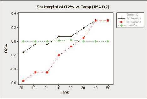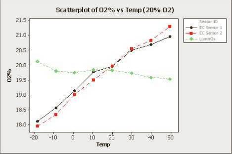 下圖顯示溫度變化時(shí) LuminOx 的輸出仍能保持恒定。電化學(xué)傳感器在同等條件下,就會發(fā)生很大的變化。這三種傳感器在溫度從-20℃到+50℃的變化范圍內(nèi),通入不同氧濃度的氣體。下圖顯示的結(jié)果是通入 0%O2 和20%O2 濃度的氧氣示意圖。