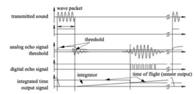 超聲波傳感器檢測(cè)距離原理是:測(cè)出發(fā)出超聲波至再檢測(cè)到發(fā)出的超聲波的時(shí)間差,同時(shí)根據(jù)聲速計(jì)算出物體的距離。由于超聲波在空氣中的速度與溫濕度有關(guān),在比較精確的測(cè)量中,需把溫濕度的變化和其它因素考慮進(jìn)去。