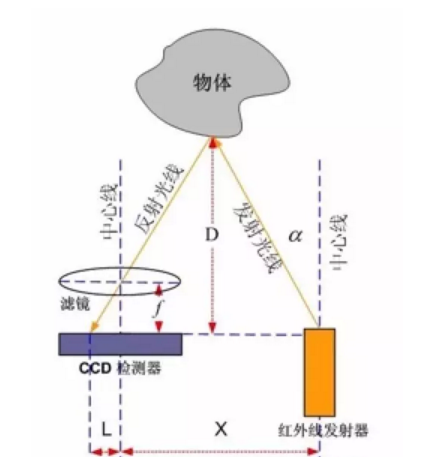紅外測(cè)距都是采用三角測(cè)距的原理。紅外發(fā)射器按照一定角度發(fā)射紅外光束,遇到物體之后,光會(huì)反向回來(lái),檢測(cè)到反射光之后,通過(guò)結(jié)構(gòu)上的幾何三角關(guān)系,就可以計(jì)算出物體距離D。