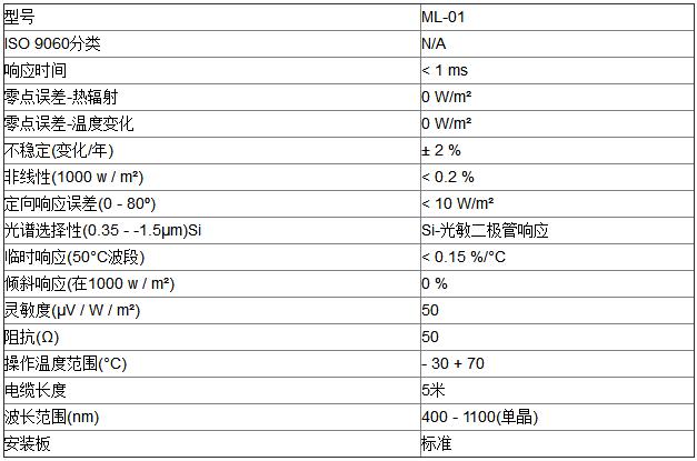 ML-01型硅傳感器是參考單元和寬帶熱電比熱計的鏈接。與參考傳感器相比,它有適當(dāng)?shù)挠嘞抑担蚁鄬o湊,但有好處與光伏組件(響應(yīng)時間、光譜和溫度響應(yīng))相同。ML-01是一種工業(yè)級太陽能傳感器,專門用于性能比測量作為氣象、農(nóng)業(yè)和環(huán)境研究的輻照度測量應(yīng)用。傳感器體的緊湊尺寸使它易于集成在任何應(yīng)用程序中使用它或者沒有安裝板。對于全球水平測量應(yīng)用,傳感器可以安裝水平位置與標(biāo)準(zhǔn)可拆卸安裝板與精神水平和水平腳。具有防紫外線擴(kuò)散的單硅探測器在低太陽高程時也給出了余弦響應(yīng)角度。由于圓錐的作用,使其在擴(kuò)散面上的淤積或水沉積作用小幾何形狀。ml - 01根據(jù)適用于PV的國際校準(zhǔn)方法進(jìn)行校準(zhǔn)參考細(xì)胞(25°C / AM1.5G 1000 w / m2 AAA太陽能模擬器(IEC 60904 - 3)。所有EKO貿(mào)易輻射傳感器可追溯至世界輻射參考(WRR)。該傳感器的低輸出電壓可以很容易地轉(zhuǎn)換成4 - 20ma電流或更高的電壓MS-4 . .20 ma轉(zhuǎn)換器。mV/ mA轉(zhuǎn)換器可以在程序中預(yù)先編程和優(yōu)化操作范圍與通用測量設(shè)備兼容。