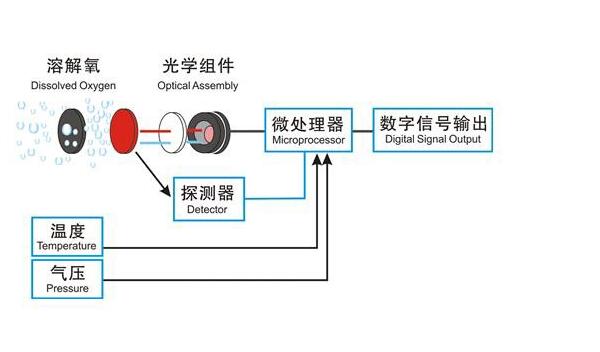 熒光法溶解氧傳感器是基于物理學(xué)中特定物質(zhì)對活性熒光的猝熄原理。來自一個發(fā)光二極管(LED)發(fā)出的藍光照射在熒光帽內(nèi)表面的熒光物質(zhì)上,內(nèi)表面的熒光物質(zhì)受到激發(fā),發(fā)出紅光,通過檢測紅光與藍光之間的相位差,并與內(nèi)部標定值比對,從而計算出氧分子的濃度,經(jīng)過溫度和氣壓自動補償輸出值。