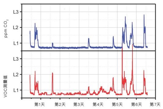 圖3:在多人使用會議室數(shù)小時后,VOC傳感器和CO2傳感器同時運作時的測量值比較