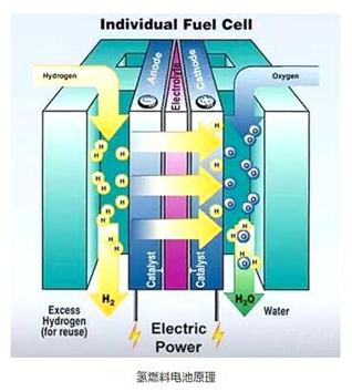 氫燃料電池的基本原理是電解水的逆反應,把氫和氧分別供給陽極和陰極,氫通過陽極向外擴散,并與電解質(zhì)發(fā)生反應,釋放出的電子通過外部的負載到達陰極,是一種將存在于燃料與氧化劑中的化學能直接轉(zhuǎn)化為電能的發(fā)電裝置。從外表上看有正負極和電解質(zhì)等,像一個蓄電池,但實質(zhì)上氫燃料電池車無需充電,只需加氫。打個比方說,純電動車的電池就像儲電站,而氫燃料電池就像發(fā)電站。