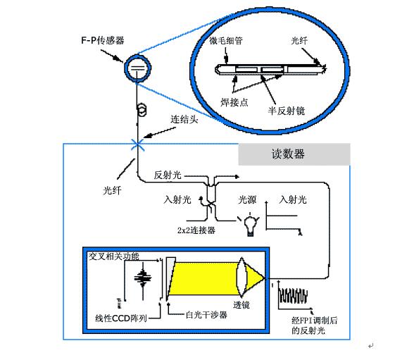 實(shí)際使用時(shí)將傳感器與讀數(shù)器(Demodulator)連接,讀數(shù)器中白光二極管光源發(fā)出的光從連接讀數(shù)器的光纖的一端入射,傳輸?shù)竭B接Fabry- Perot傳感器,再由多模光纖射出,照射在TFFI干涉儀(光楔)的表面。當(dāng)TFFI水平移動(dòng)時(shí),照點(diǎn)的位置也會(huì)不同。光楔上下兩個(gè)表面都鍍有半反射 膜,因而構(gòu)成了Fabry-Perot腔體。當(dāng)讀數(shù)器發(fā)射的白光的一部分被第一個(gè)半反射鏡反射后,其余的白光穿過Fabry-Perot腔體,且再一次被 第二個(gè)半反射鏡反射回來,兩束反射光相互干涉,使得原來入射白光的光譜被調(diào)制。