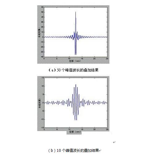 給解調(diào)干涉儀輸入圖3所示的調(diào)制光信號(hào)。為簡(jiǎn)單起見,這里只考慮其中光強(qiáng)極大值對(duì)應(yīng)的波長(zhǎng)。這些波長(zhǎng)形成的干涉結(jié)果在CCD的長(zhǎng)度方向上進(jìn)行矢量疊加,由 于是白光干涉,所以疊加的次數(shù)越多,CCD上得到的干涉條紋越細(xì)銳。Matlab下的仿真結(jié)果如圖所示。