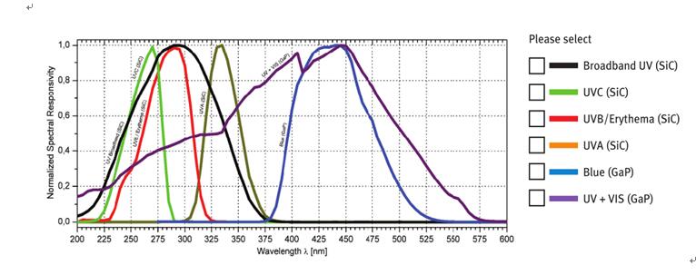 一般在高溫UV固化中,推薦使用專門用于高溫固化中的UV-Cure-HT,該傳感器的使用環(huán)境溫度范圍是-55℃~170℃。傳感器是微弱電流輸出,一般配備一個信號處理板一起使用,該板的輸出為0-5V或者4-20mA。傳感器能選擇檢測波段包含Broadband UV,UVA,UVB,UVC,UV-Index,Bluelight and UV+VIS,檢測光譜范圍曲線如下所示: