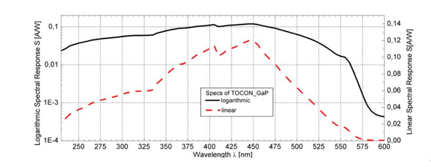 檢測范圍為190-570nm(445nm峰值響應)的GaP材質的紫外線傳感器TOCON-GAP9的檢測范圍可以從420uw/cm2到4.3W/cm2,由于內部集成有放大電路,故使用溫度范圍是-25~85℃。0-5V輸出方式,傳感器的光譜響應圖如下:
