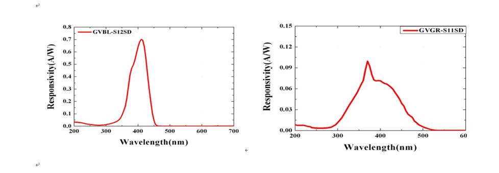 針對365nm,385nm,405nm等波段的傳感器,目前市面上質量比較好的主要有工采網(wǎng)從國外進口的紫外線傳感器 - GVBL-S12SD和可見光傳感器 - GVGR-S11SD此類產(chǎn)品,此類產(chǎn)品均有貼片式封裝和TO封裝模式,也可以做成探頭,高溫型UV探頭主要是通過光纖方式來測量紫外線強度。此類產(chǎn)品具體曲線圖如下所示: