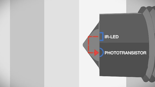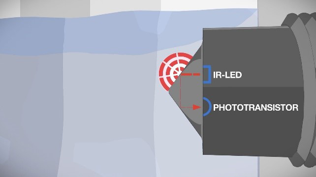 光學液位開關(guān)尖端的底部,精確的安裝著一個紅外LED和光電晶體管。當尖端處于空氣中時,來自LED的紅外光在尖端周圍反射,并回到光電晶體管。當開關(guān)的尖端浸入液體中時,紅外光從尖端逸出,導致到達光電晶體管的光總量發(fā)生變化,從而判斷有不同的介質(zhì)介入,使得液位開關(guān)的輸出改變狀態(tài)(高電平變?yōu)榈碗娖?,或者相反。?/p>