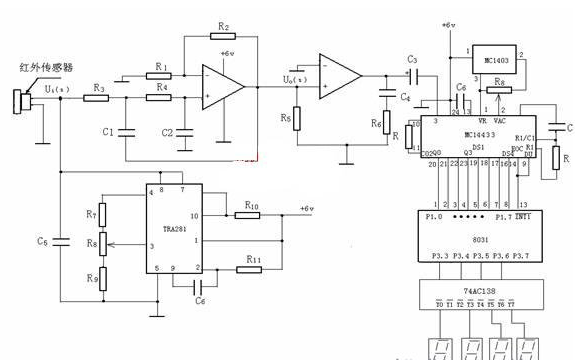 按照上述設(shè)計(jì)原理,設(shè)計(jì)的二氧化碳檢測電路如圖3所示。工作原理是首先由紅外傳感器將探測到二氧化碳?xì)怏w的濃度并轉(zhuǎn)換成電信號(hào),濾波電路提取電信號(hào)并輸出到放大電路,經(jīng)過單片機(jī)系統(tǒng)處理后輸出,再由74AC138送入顯示電路,以實(shí)現(xiàn)對(duì)二氧化碳?xì)怏w濃度的檢測。