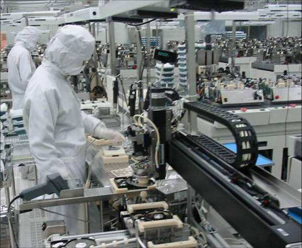 眾所周知硬盤中磁頭同盤片之間的距離很小一般來(lái)說(shuō)只有十萬(wàn)分之一厘米因此在硬盤工廠中生產(chǎn)硬盤必須在無(wú)塵的環(huán)境中進(jìn)行;所以工作人員進(jìn)入廠房時(shí)必須穿上防塵服才能進(jìn)入。生產(chǎn)過(guò)程中大部分精細(xì)的裝配環(huán)節(jié)都由機(jī)械臂自動(dòng)完成在所有內(nèi)部零件被安裝好后硬盤基本成型,加上后蓋后工作人員穿上防塵服進(jìn)行檢驗(yàn)。